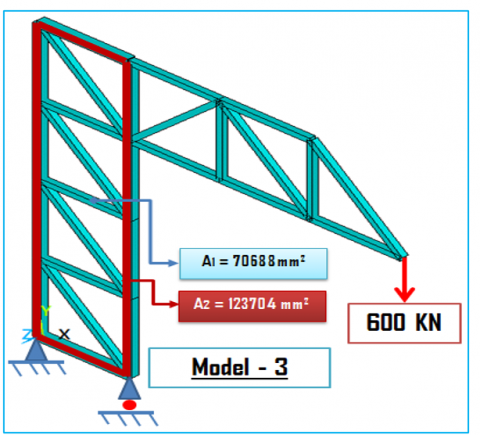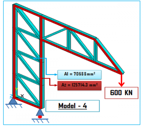Four steel models of truss structures with high loads were created. As seen in Figure 2 (Model - 1), the cross-sectional area of every component in the first model was the same. The second model's components had a different cross-sectional area and were arranged differently, as seen in Figure 2 (Model - 2). The third model's cross-sectional area was likewise rearranged and displayed as Figure 2 (Model - 3). Additionally, the fourth model's cross-sectional area was different and arranged as Figure 1 (Model - 4) illustrates.