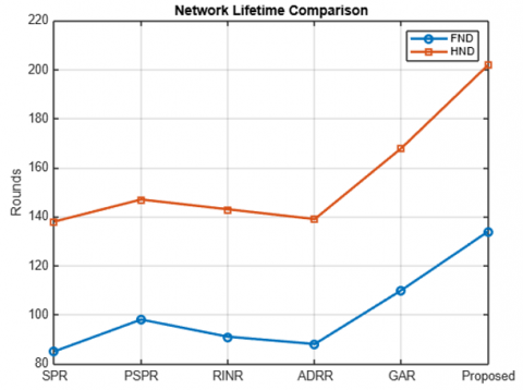 The experimental results clearly prove the effectiveness of constructed multi-layer clustering with CNN-GRU based routing in comparison to traditional and evolutionary-based routing techniques. The proposed scheme obtained a substantial increase in network lifetime: the FND was obtained at 134 rounds, while 50% node death (HND) was reached at 202 rounds. This longer period of operation is due to that the model spreads the energy consumption uniformly by region through the intelligent cluster and dynamic route prediction of the GRU module as shown in Figure 1.