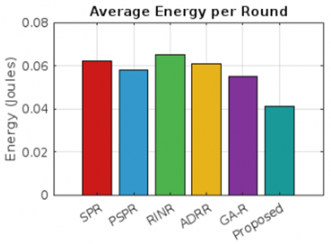 The energy consumption represents the overall energy dissipation in the network. As for the average energy cost, the proposed has the lowest average energy cost per round (0.041 J) in comparison to borders, including the GA-based routing method, which reported a value of 0.055J. This energy efficiency can be attributed to the MPU’s strategy of multi-layer clustering reducing the long distance communication, and to GRU due to the fact of learning about energy trends, preventing the participation of low-power nodes as shown in Figure 2.