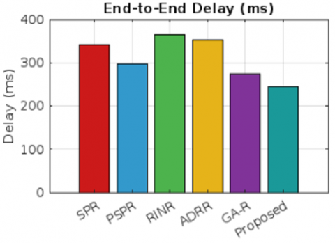 The average end-to-end delay was further reduced by the proposed scheme with a latency of 244 ms. This is significantly smaller than other methods, e.g., the next best method, GA-based routing, is at 275 ms. The ability to model in time of GRU helps the delay reduction by preferring paths with lower latency in history as shown in Figure 4.