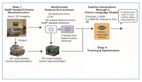The above algorithm which effectively works in phase wise for generating captions with more meaningful information based on the spatial and occlusion understanding. The algorithms work starts with NeRF-based 3D Scene Reconstruction which takes the 2D Images as input and learns the volumetric scene representation and models for identifying Depth & Geometry Occlusions and Lighting & Shadows finally produces the 3D voxel-based scene representation that gets processed to extract features. In the second phase the Multimodal Feature Extraction it extracts the 2D features based on CLIP Method for object recognition and extracts 3D-aware features from NeRF to collect spatial relations, this phase produces the fusion of both using a Transformer-based fusion network. The third phase is to generate the captions through a Vision-Language Model by employing LLaVA-13B or GPT-4 to produce captions as an extension. We fine-tuned the model with reinforcement learning for spatial accuracy and also rank-based strategy to maximize caption diversity and relevance. The last phase is to test the accuracy of the model based on the various parameters and also to optimize the model this phase starts with the training on 3D-aware datasets, Replica, 3D Scene Graph datasets and apply contrastive learning for better feature alignment and comparing with BLEU, METEOR, and human evaluation for benchmarking.