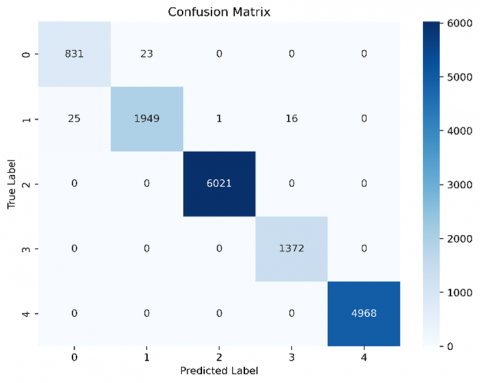 Accuracy: The high diagonal values in the confusion matrix indicated a high proportion of properly identified examples, which was consistent with the model's total accuracy of 0.9983. This highlights the efficiency of the federated learning technique and the DNN architecture in capturing the underlying patterns inside the dataset. Figure 6 shows the local model training and validation performance of accuracy and loss. These results are based on the overall dataset for each client. The local model, trained on the whole dataset without using federated learning, earned a respectable accuracy of test (0.9965), and train (0.9915) indicating its capacity to learn from the data and generate correct predictions. However, the centralized method has drawbacks in terms of privacy, generality, and scalability. Centralizing the data for training presented possible privacy problems, and the model's exposure to a single dataset may have limited its capacity to generalize to new or varied data. Employing federated learning to train a local model on distributed data, as shown in Figure 7, resulted in a large accuracy boost to (0.9983) demonstrating the capacity to exploit heterogeneous data while maintaining privacy. This method improved the model's performance by increasing accuracy, recall, and F1-score while also addressing critical issues like overfitting and generalization. Federated learning reduced the danger of overfitting and improved generalization to previously unknown data by training on localized datasets and pooling updates. Furthermore, validation approaches were critical in this process, with local validation tracking individual model growth and global validation offering an unbiased assessment of the final model's performance. Our analysis is shown in Table 6 accuracy and other metrics. The best accuracy (0.9983) was obtained by the federated learning strategy, indicating its exceptional capacity to generalize from a variety of data sources.