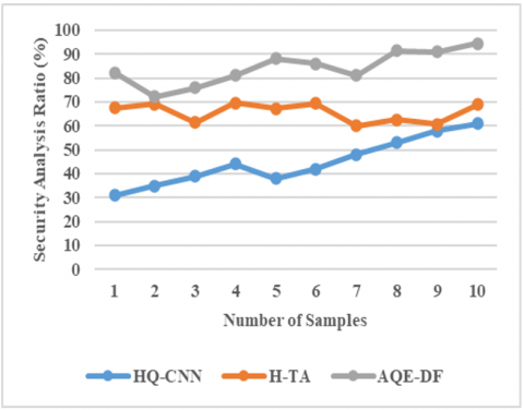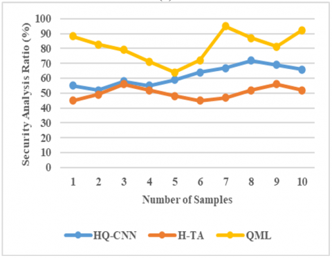 By demonstrating how QML can enhance automation security and assure the privacy and authenticity of optoelectronic robotic structures' selection methods, the AQE-DF protection assessment attracts attention to the significance of this era. Research like this helps us better understand the interplay between quantum, more potent accuracy, and safety, which is crucial for constructing extra sturdy and solid quantum-generation automation structures. Figure 9(a) indicates that the Security Analysis achieves a superb 94.8% compared to the AQE-DF approach. Compared to QML, the security grade is 92.8%, as shown in Figure 9(b). These consequences demonstrate that AQE-DF has a higher safety assessment than QML.