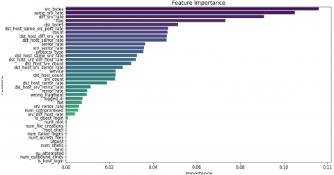 Figure 2 ranks features by importance, with the most significant at the top and the least important at the bottom. The x-axis shows importance scores from 0.00 to 0.12. The top five features are src_bytes, same_srf_rate, flag, dst_host_srv_serror_rate, and serror_rate. Moderately important characteristics are dst_host_same_srv_rate, dst_bytes, count, and difficulty, with scores above 0.04 but below the top features. Less Important Features: The importance score drops substantially as you go down.