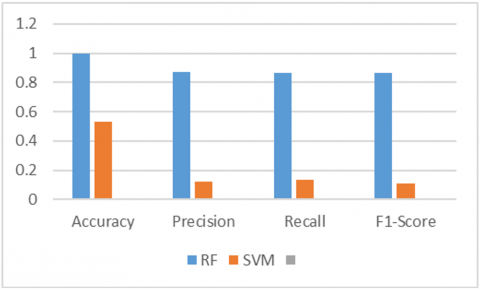 Figure 3 demonstrates that Random Forest (RF) consistently surpasses Support Vector Machine (SVM) across all assessed criteria. Accuracy: RF attains an accuracy of 1.0 (or nearly so), signifying perfect or near-perfect classification, whereas SVM's accuracy is approximately 0.53. Precision: Random Forest exhibits a precision of roughly 0.88, markedly surpassing the precision of Support Vector Machine, which is approximately 0.12. Recall: Likewise, the recall of RF is approximately 0.88, far surpassing SVM's recall of roughly 0.13. The F1-Score for RF is roughly 0.88, far surpassing SVM's F1-Score of around 0.11. The image unequivocally illustrates that the Random Forest model significantly outperforms the Support Vector Machine model in the assessed job, as indicated by the classification performance measures.
