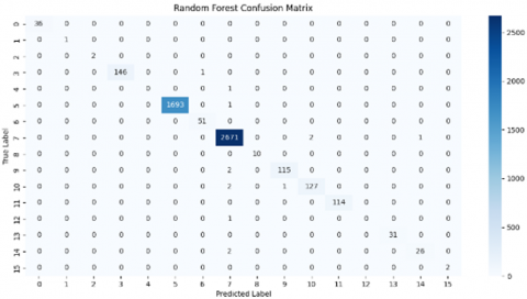 In terms of classes 5 and 7, both models appear to do exceptionally well, as seen by the high number of right classifications they achieve. In comparison to Random Forest, Support Vector Machines (SVM) have 147 correct predictions for class 3, while Random Forest only has 146. When compared to Random Forest, SVM has 1694 valid predictions for class 5, while Random Forest only has 1693. Random Forest has 2671 correct predictions for class 7, whereas Support Vector Machines have 2672 correct predictions. When compared to Random Forest, SVM has 117 valid predictions for class 9, while Random Forest only has 115. Comparatively, Random Forest only has 127 valid predictions for class 10, whereas SVM has 130 correct predictions. The apparent flaws include the fact that RF successfully identified ten occurrences of class 1, whereas SVM incorrectly classified one instance (which was anticipated to be 7) and shown that there were no valid classifications achieved on the diagonal for class 1. It appears from here that RF is more effective in classifying Class 1. Classes 4, 6, and 12b The diagonal values of True Label 4, 6, and 12 are either extremely low or entirely absent, which makes it difficult for both models to correctly categorize instances of these labels. As a result, it may be deduced that these classes provide difficulties for both algorithms or have a limited number of instances. The following is a condensed version of the misclassifications that were given for both models: A case of True Label 3 is incorrectly identified as True Label 6 by RF. A case of True Label 1 is incorrectly identified as True Label 7 by SVM. There are 51 instances of True Label 5 being incorrectly classified as True Label 6 by both models. Misclassifications from True Label 7 to other classes are observed in both models, albeit the specific classes presented by each model are slightly different (RF: 9, 13; SVM: 13, 14). Each of the models incorrectly assigns the value 10 to instances of True Label 12.