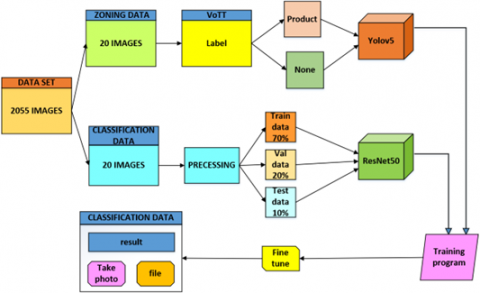 Figure 3 illustrates a process for product classification and zoning using machine learning models. It begins with a dataset of 2055 images. This dataset is then divided into two parts: product zoning data and product classification data. For the product zoning data, 20 images are selected and labeled using VoTT (Visual Object Tagging Tool) for two categories: "product labeling" and "none product". These labeled images are then used to train a YoloV5 model. For the product classification data, 2035 images are used. These images undergo preprocessing before being split into three sets: train data (70%), validation data (20%), and test data (10%). These sets are used to train, validate, and test a ResNet50 model.