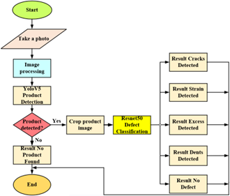 Figure 4 illustrates an automated image-processing workflow for quality inspection, beginning with image capture and analysis using YOLOv5 (for object detection) and ResNet (for classification). The system identifies defects such as excess details, device flaws, or slams, followed by a decision tree to categorize or reject items. Finally, the process includes a retesting phase to validate results, ensuring accuracy in industrial quality control.