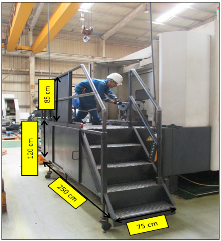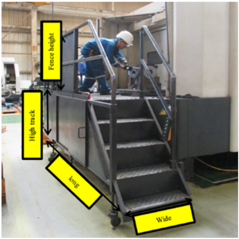 Based on Table 16, it can be seen that there are differences in the dimensions between the actual work platform and the proposed design. These differences include a reduction in the platform height by 55.7 cm, an increase in the platform length by 77.8 cm, an increase in the platform width by 36.5 cm, an increase in the guard height by 22.5 cm, and the addition of a tool table with dimensions of 111.5 × 77.8 × 95.7 cm.