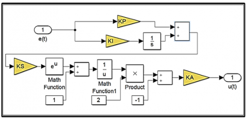 $\begin{gathered}G_1(\mathrm{~s})=\mathrm{K}_{\mathrm{P}} \cdot \mathrm{E}(\mathrm{s})+\frac{\mathrm{K}_{\mathrm{i}}}{\mathrm{s}} \cdot \mathrm{E}(\mathrm{s}) \\ G_1(\mathrm{~s})=\mathrm{K}_{\mathrm{P}}\left(1+\frac{\mathrm{K}_{\mathrm{i}}}{\mathrm{k}_{\mathrm{p}} \mathrm{s}}\right) \mathrm{E}(\mathrm{s})\end{gathered}$ (1)