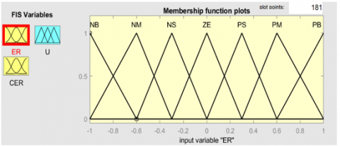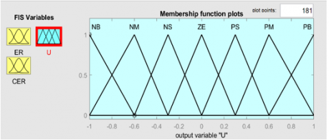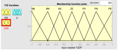 The simulation uses multiple trigonometric membership functions with a sum/product inference scheme on zero-degree Takagi-Sugino output functions. The output sets are singular values. A weighted average defuzzification method is used to compute the final output value, from i = 1 to R output subsets, zi, weighted by the input fuzzy set membership values, µj, for j = 1 to n [26]. Seven triangular membership function (MF) as shown in Figure 7. Where the Figure 7(a) input for error function (ER), Figure 7(b) input for change of error function (CER) and Figure 7(c) is the output function (U).