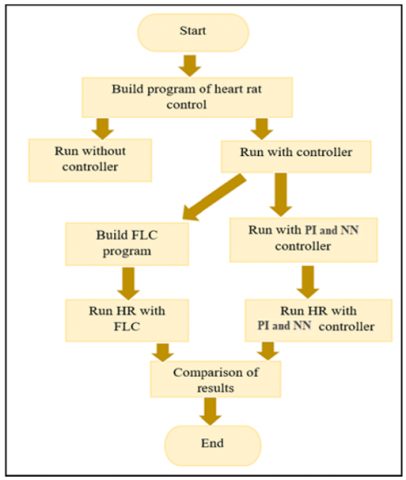 In this work, simulation of the heart rate controllers designed using three types of controllers i.e. Different methods to system control are provided by the P-I controller, Neural Network (NN) controller, and fuzzy logic controller (FLC), which vary in complexity, flexibility, and application applicability. The P-I controller reduces steady-state error for linear systems by combining proportional and integral actions; nevertheless, it has trouble with extremely nonlinear dynamics The NN controller, on the other hand, uses machine learning to adjust to nonlinear and time-varying systems; this offers flexibility but comes with a high computational cost and training data need. Although it requires a more complicated design, the FLC is well-suited for complex systems without the need for an explicit mathematical model because it effectively manages uncertainty and imprecise inputs using fuzzy sets and linguistic conventions [20, 21]. System parameters, performance requirements and implementation viability all influence which of these controllers is optimal. The MATLAB program is used here for the system simulation.