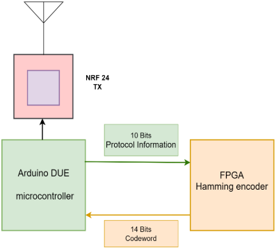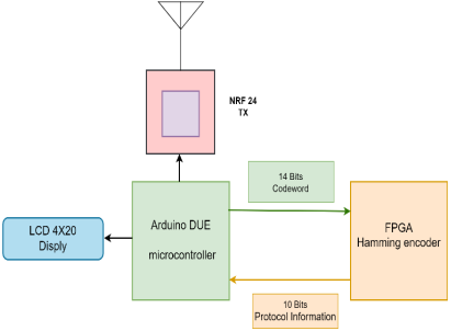 The binary-numbered data is encoded using the FPGA Hamming (14, 10) encoder, which adds 4 parity bits to the 10-bit data, resulting in a 14-bit code word (601, 604). This encoding method is designed to correct single-bit errors that may occur during wireless transmission among neighboring devices in outdoor environments with high noise levels. The encoder operates in real-time, utilizing VHDL for parallel processing, which minimizes latency while maximizing throughput. The encoded code words are transmitted wirelessly via the NRF24L01+ radio, incorporating acknowledgments and retries to enhance reliability. Figures 3 and 4 illustrate the overall bidirectional data flow architecture, featuring an integrated transmitter-side encoding process and a receiver-side decoding process, ensuring successful transmission of fault coding across the wireless communication channel.