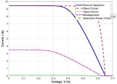 2. Advanced Formulated Mathematical Modelling: The overall systematic formulated investigations for characterization of photovoltaic behavior during different faults, such as short circuits, open circuits, and misalignments, using robust threshold-based fault detection algorithms.