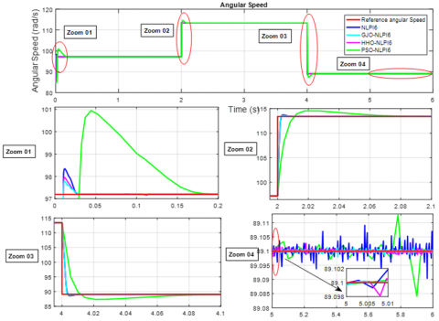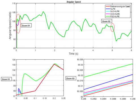 The rotor speed response under a step wind profile using the optimized NLPI controller tuned with PSO, HHO, and GJO algorithms is shown in Figure 16.