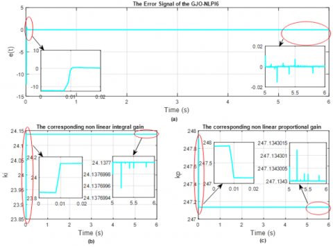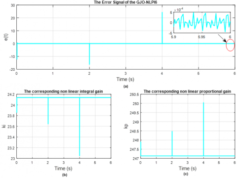 Figure 17. (a) The error signal curve of the GJO_NLPI6, (b) The proportional nonlinear gain of the GJO-NLPI6, (c) The integral nonlinear gain of the GJO-NLPI6