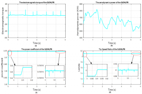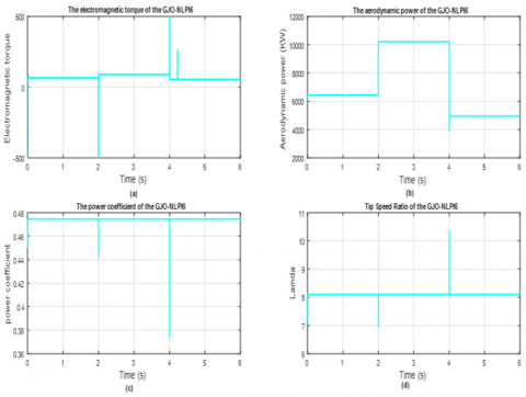 Figure 18. (a) The electromagnetic curve of the GJO-NLPI6, (b) The aerodynamic power curve of the GJO-NLPI6, (c) The power coefficient using the GJO-NLPI6, (d) The tip speed ratio using the GJO-NLPI6