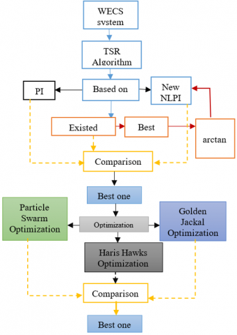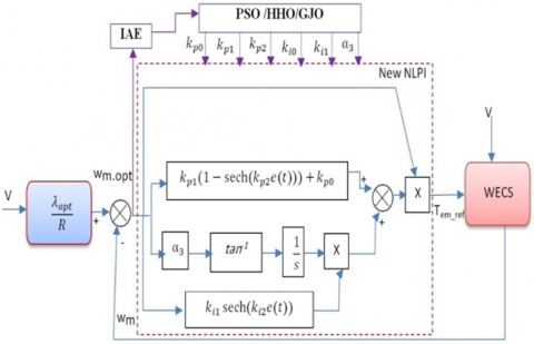 Wind Energy Conversion System (WECS), Permanent Magnet Synchronous Generator (PMSG), Maximum Power Point Tracking (MPPT), architecture, nonlinear PI controller, PSO algorithm, HHO algorithm, GJO algorithm
