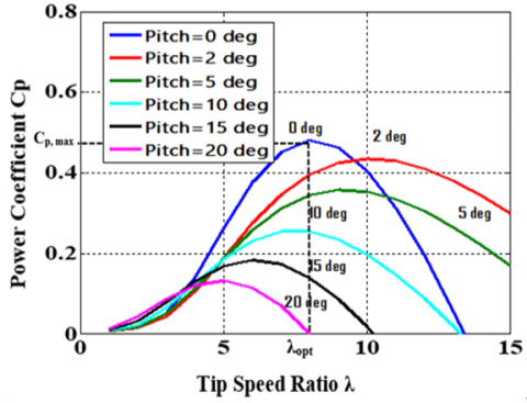 $C_p=\left[0.5176\left(\frac{116}{\lambda^{\prime}}\right)-0.4 \beta-5\right] exp \left(\frac{-21}{\lambda^{\prime}}\right)+0.0068 \lambda$ (2)