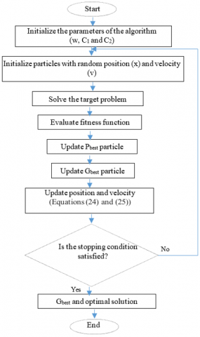 where, $V_{i,}^{t+1}$ and Vit denote the velocity of each particle at the current and previous iteration, respectively, $X_{i,}^{t+1}$ and $x_i^t$ represent the position of particles in the current and previous iterations, respectively, $p_{i, { best }}^t$, and $G_{b e s t}^t$ represent the personal and global best of each candidate and the hole swarm, and $c_{1,2}$ and w are the personal and global learning coefficient, inertia weight and R1,2 a random number. Figure 7 depicts the method's flowchart.