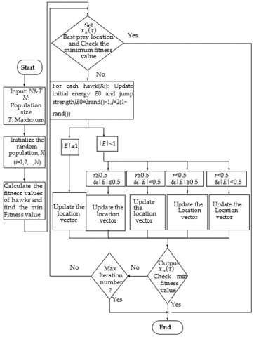 As the algorithm progresses, it shifts from exploration to exploitation. This shift happens when the hawks concentrate on identified prey. The prey's energy, denoted as E0, fluctuates between -1 and 1, reflecting the prey's attempts to evade its predators. The algorithm then enters the exploitation phase, where the hawks attack and capture prey. This phase intensively optimizes solutions by focusing on the best discoveries. The cooperative behavior of the hawks is modeled to maximize capture chances, continually adjusting solution positions to converge towards optimal solutions. The flowchart that illustrates the HHO algorithm is shown in Figure 8.