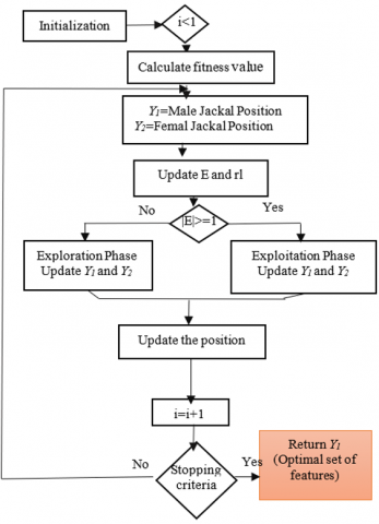 Here, t represents the current iteration of the algorithm, $\Upsilon_M(t)$ and $\Upsilon_{F M}(t)$ identify the positions of the male and female jackals, Prey(t) represents the hunting position vector, and $\Upsilon_1(t)$ and $\Upsilon_2(t)$ determine the updated jackal locations.
