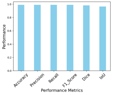 The proposed method, in comparison to existing methods, show better performance in segmentation and prediction of liver tumors shown in Figure 9. The outcomes are measured particularly with the parameters as Intersection over Union (IoU), Dice coefficient and Mean Squared Error (MSE). The proposed model has higher values of IoU that reflects that it effectively capturing the true boundaries of the affected area and thus provides more precise segmentation. This is very important in medical imaging because accuracy in boundaries of affected areas directly impacts diagnosis and treatment planning. In addition to this, the MSE is very low that indicates ability of the model to generate predictions that are closer to the actual. The lower error is a measure of efficiency of model in minimizing discrepancies between predicted and actual affected areas thereby ensuring more reliable predictions. Finally, Dice coefficient is a measure of similarity between the predicted and true segmentation and for the proposed model it is significantly higher. This indicates enhanced capability of model to correctly identify and segment affected areas of liver. These results obtained through IoU, MSE and Dice clearly indicate the better performance of the proposed model over existing methods. Thus, the proposed model is a more accurate, reliable and effective solution for liver tumor prediction and segmentation adding a valuable tool in medical diagnostics.