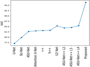 Figure 9. Comparative performance of the proposed model based on (a) MSE (b) Dice (c) IoU
