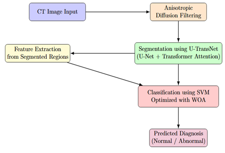 Figure 2 presents the detailed system architecture of the proposed framework, illustrating how segmentation, feature extraction, and classification modules interact. To enhance classification accuracy and overcome the imbalance in early-stage disease detection, we propose a metaheuristic-optimised classification model. A support vector machine (SVM) classifier is tuned using the Whale Optimisation Algorithm (WOA). WOA improves on the standard grid or random search techniques by intelligently exploring the hyperparameter space, leading to optimal model performance. Furthermore, cost-sensitive learning is incorporated to handle class imbalance, assigning higher weights to minority (early-stage disease) samples, thus ensuring they are not under-represented during training. The classification process begins by using the fused feature vector from the earlier step. The SVM classifier is optimised using WOA, which iteratively searches for the best kernel parameters. The combination of noise-resilient preprocessing, hybrid segmentation with attention mechanisms, and metaheuristic optimisation-based classification promises higher segmentation precision, robust feature extraction, and improved classification of early liver disease, making it a significant advancement over current techniques.