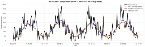 By contrast, the hybrid XGBoost-GRU approach demonstrates strong resilience. Its error values remain stable and closely aligned with those of the ideal scenario (no missing data), regardless of the duration of the missing interval. This highlights the effectiveness of the interpolation step in reconstructing informative input sequences and preventing the error saturation observed in the baseline GRU, LSTM.