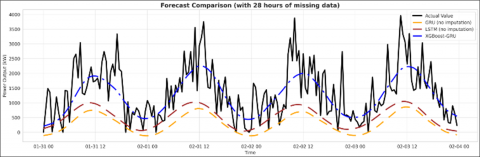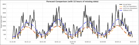 Most notably, when the XGBoost–GRU hybrid approach is employed to interpolate missing values before forecasting, the model demonstrates robust fault tolerance and stable performance. The results show that the hybrid approach achieves RMSE = 671.92kW, NRMSE = 16.8%, and MAPE = 13.17%, which are very close to the ideal scenario despite the missing-data condition.