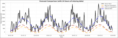 The LSTM model outperforms the GRU model, achieving an RMSE of 1112.54 kW, an NRMSE of 27.81%, and a MAPE of 21.9% when the missing-data period exceeds 24 hours.