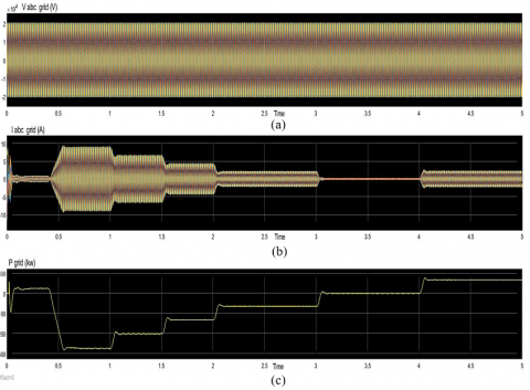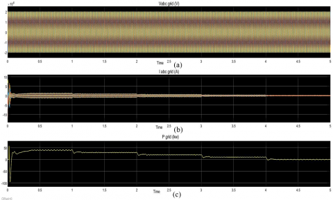 Figure 10. Grid side (a) Voltage, (b) Current, (c) Power