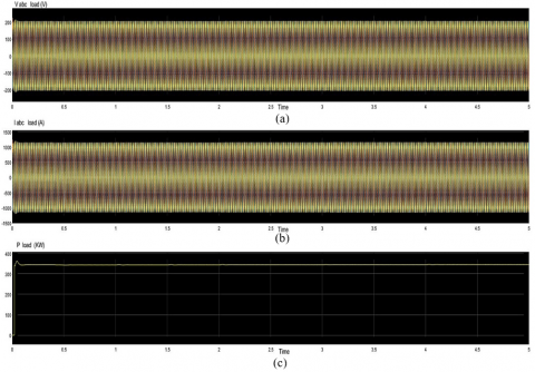Figure 15. Load side (a) Voltage, (b) Current, (c) Power