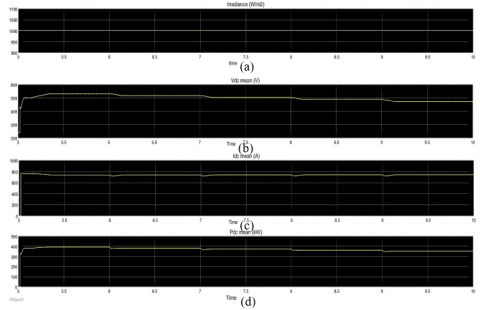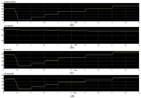 Figure 9. PV array side (a) Irradiance, (b) Voltage, (c) Current, (d) Power
