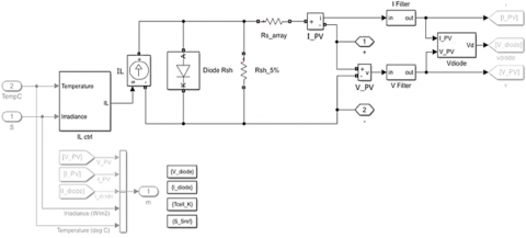 PV modules function as solar-to-electrical energy converters that generate environmentally benign DC power when illuminated. These devices consist of interconnected PV cells that can be arranged in series to increase voltage or in parallel to boost current [12]. The research model features a 350 kW array composed of 910 modules arranged in 130 parallel branches, with each branch containing 7 series connected modules to achieve the desired voltage and current characteristics. The PV array subsystem depicted in Figure 2 employs a comprehensive mathematical representation that captures the nonlinear current-voltage (I-V) behavior under varying environmental conditions [13].