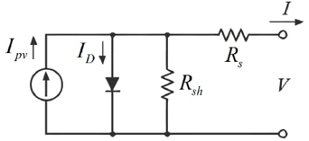 In a solar panel, several PV cells are connected in parallel and series. The way a single PV cell works is crucial to comprehend; in essence, it is a p-n junction that directly transforms solar radiation into electrical power [14]. This equivalent circuit, which is depicted in Figure 3, is made up of a series resistance $\left(R_s\right)$, a diode current $\left(I_D\right)$, a current source $\left(I_{P V}\right)$, and a shunt resistance $\left(R_{s h}\right)$ connected in parallel to the diode.