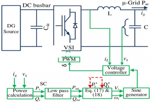 The inverter current controller consists of a Phase-Locked Loop (PLL), a current regulator, a DC voltage regulator, a Pulse Width Modulation (PWM) and a reference generator. The desired voltage is compared to the DC voltage measured by the Vdc regulator.