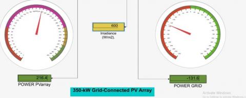 The modeling circuit consists of, solar PV array, MPPT, DC-AC inverter (grid-tie inverter), current control, phase lock loop (PLL), filter, and utility grid. The grid-connected system that was developed was evaluated using a three-phase load of 350 kW, as illustrated in Figure 7. The performance of the PV array, inverter output power, and the power exchanged with the grid were analyzed under different levels of irradiance with a remaining temperature of 25℃.