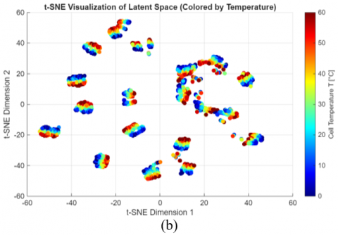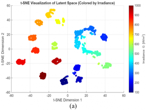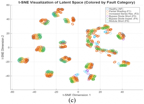 Figure 13. t-SNE visualization of the learned latent space, colored by (a) Irradiance (G), (b) Temperature (T), and (c) Fault category