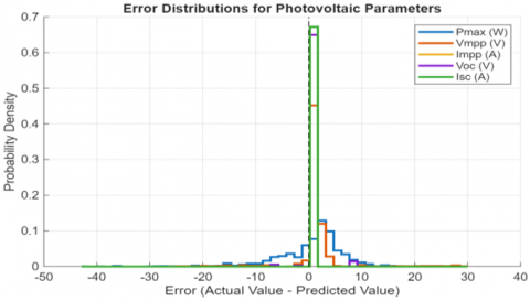 The distributions in Figure 13 tell a clear story. All five are sharply peaked and centred on zero, a strong sign that our model is unbiased. Looking closer at Isc, its PDF is noticeably the most concentrated of the group. This confirms that the model's absolute performance for this specific parameter is, in fact, excellent. Nevertheless, the overall performance confirms that the model has acquired a physical understanding of the system, far beyond simple curve-fitting.