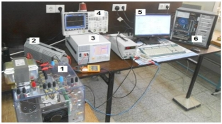 Figure 1. Photograph of the emulator used for data collection: 1) buck converters, 2) load, 3) programmable power source, 4) scope, 5) ControlDesk, 6) DS1104 platform [20]