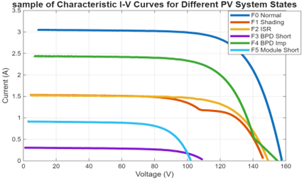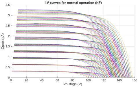 To illustrate the rich diversity of environmental conditions within each operational class, Figure 3 shows the complete set of 130 I-V curves generated for the Healthy Condition (NF) by systematically varying irradiance from 100 to 1000 W/m² and temperature from 0℃ to 60℃.