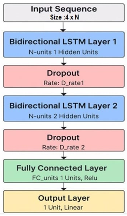 The architecture implemented in this work is a stacked BiLSTM network designed specifically for the sequence-to-sequence regression task. As visualized in Figure 6, the model is composed of layers, with key hyperparameters such as the number of hidden units and the dropout rate detailed in Table 1. The specific values for the structural hyperparameters were determined through the systematic optimization process described in the following sections.