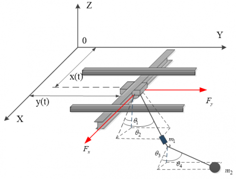 where, $M_1$ and $M_2$ are trolley mass along x -axis and y -axis, respectively; $m_1$ is hook mass; $m_2$ denotes payload mass; $l_1$ and $l_2$ denote hook length vaf cable length, respectively.