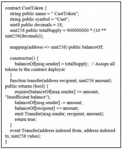 1. CustToken Contract: Creates and manages CustToken and its specifically developed for research and experimentation. The total supply of CustToken is fixed at 900,000,000 units as shown in Figure 1. This means that no more tokens will be minted after deployment, ensuring that the token is not inflationary. The token uses 18 decimal places, which is a standard for ERC-20 tokens. This allows for precise transactions.