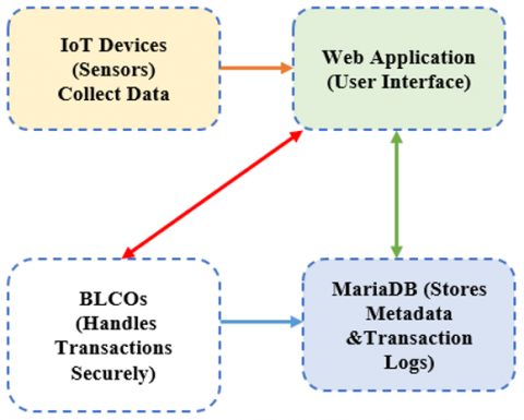 BLCH-enabled IoT data framework shown in Figure 4 illustrates the integrates IoT devices, a web application, BLCOs on a blockchain, and MariaDB to enable secure and transparent IoT data transactions.