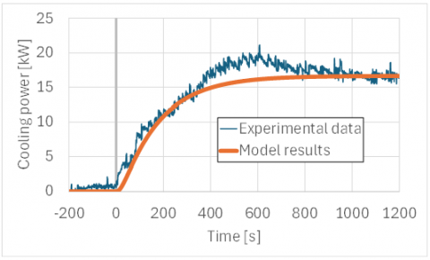 A similar approach was considered for the heat pump whose cooling side provides the additional cooling energy to the grid (“C. gen. 2” in Figure 1). While the steady-state performance modelling was based on the measured data reported in the study [20], the transient response was based on single first order delay blocks. Following preliminary settings of this time constant, the model was successfully validated against experimental data. For instance, Figure 2 shows the good matching between calculations and experimental measurements (accuracy in the ±3% range) for the cooling power produced by the R600 heat pump during a start-up phase.