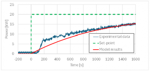 The model of the thermal storage vessel was based on global power input-output balance to calculate its State of Charge. Moreover, a single first order delay block was included for simulating the time-dependent response. It was modelled considering a system composed of different 500 l chilled water tanks installed in parallel. To be general, since the amount of tanks depends on the operative temperature difference, no detailed design is included in this work and every analysis is reported in the form of inlet-outlet power exchange and stored energy. The validation of this model was performed considering a single 500 l tank internally equipped with a 30 kW electrical heater [23]. In the validation test presented in Figure 3, starting from equilibrium conditions, at time zero the heater set-point was switched to 20 kW. The circuit response that mainly depends on the dimension (thickness of the vessel and the pipes, circuit length, thermal insulation, etc.) was reported in Figure 3. Although the simplified model was not able to calculate details, such as the temperature distribution in the vessel, the model results were able to produce the time-dependent trend with an accuracy level in agreement with the measurements (errors in the ±3% range) and with the accuracy needs of this optimization analysis.