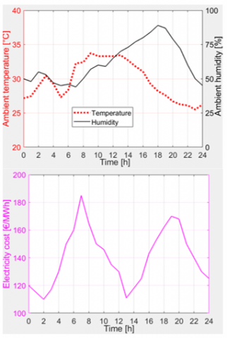 For the case study presented in this paper, the same input values of study [12] are considered. In details, the ambient conditions and the electricity cost during 24 hours are shown in Figure 4. These data are typical of a summer day at intermediate latitude for a location with a double-peak trend for electricity costs [14]. The following further input values are considered (as in the study [12]): 10 €/MWh for Operation and Maintenance (O&M) of both inverse-cycle systems, 2 €/m3 for the water obtained from the aqueduct, and 45 €/MWh for the cooling energy. However, differently from study [12], no cooling energy selling is remunerated because the related demand is considered part of the same entity in charge of the grid management. So, the cooling energy price is used only for valorizing cooling energy in the storage system.